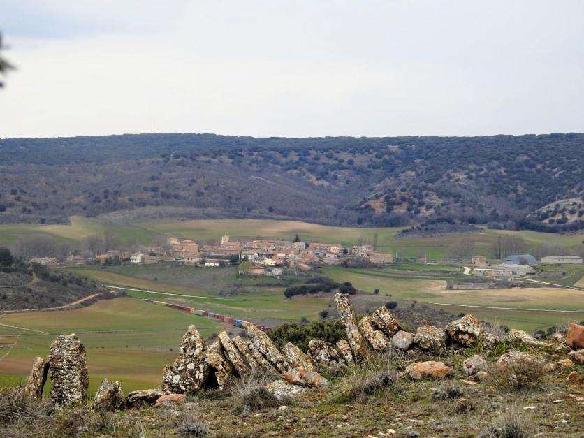 Desde las Pedrizas, entre paredes, al fondo el pueblo y el monte,