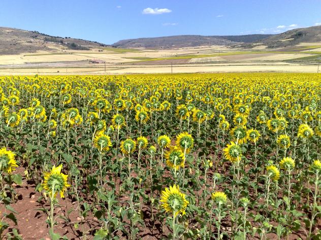 Los heliotropoos (gira-soles) vuelven hacia el sol en la mitad de su camino. Al fondo las suaves colinas de Riosalido. A la izquierda Bujalcayado recostado en la ladera y a la derecha la ermita que fue de San Bartolo..
