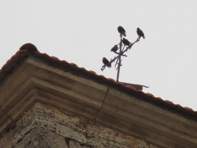 Pájaros posados en la cruz del campanario,