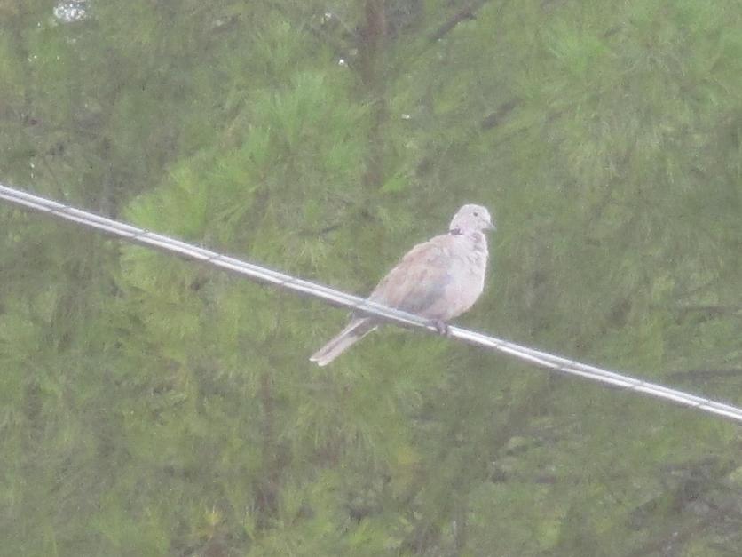 Tórtola sobre un cable y detrás pinos,