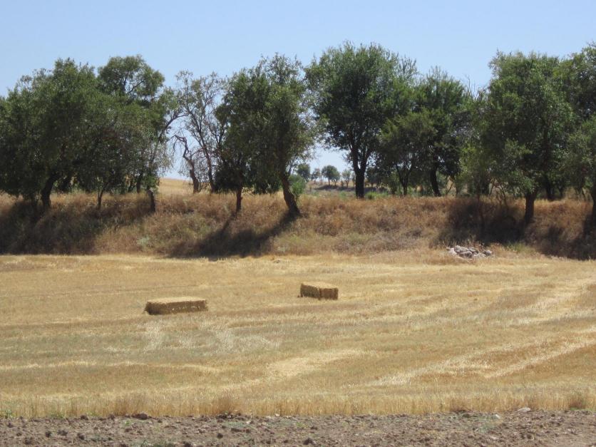Campo segado, pacas y almendros,