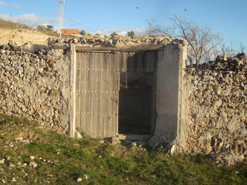 Antigua portada de madera en un muro de piedra,