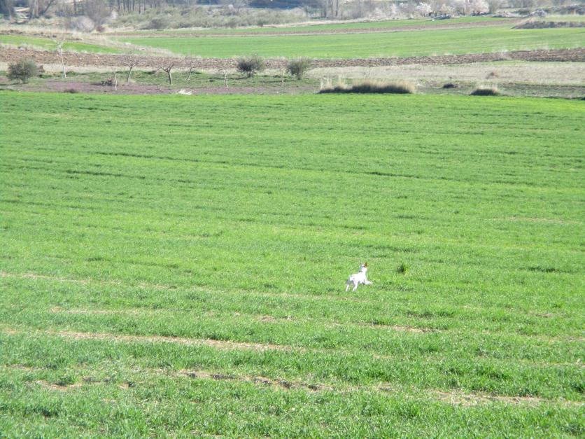 Mi perra correteando pájaros en un campo,