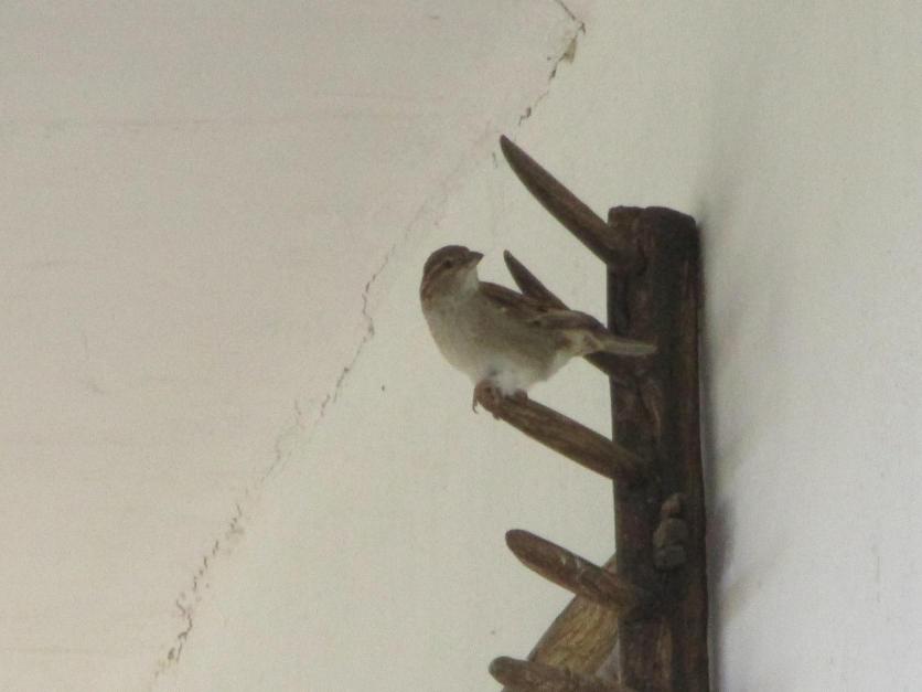 Gorrión hembra posada sobre un rastrillo,