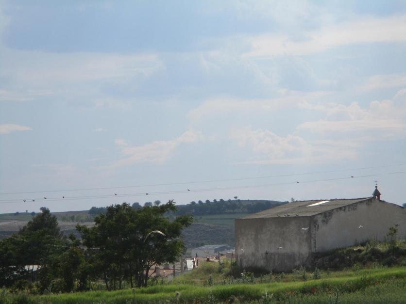 Paisaje de las afueras del pueblo con pájaros posados en los cables del tendido,