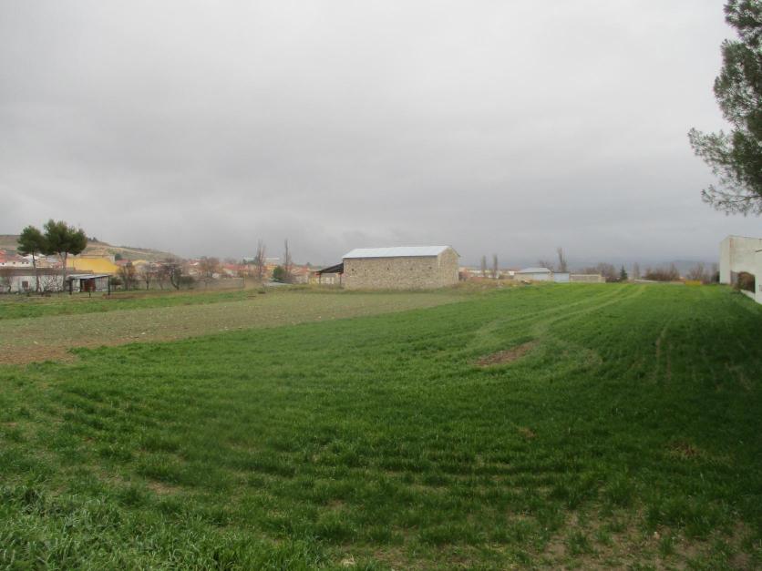 Granero y pueblo en día de tormenta,