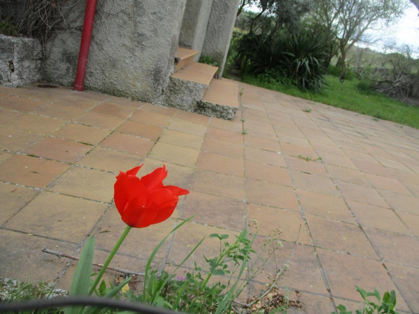Solitario tulipán rojo en un jardín particular,