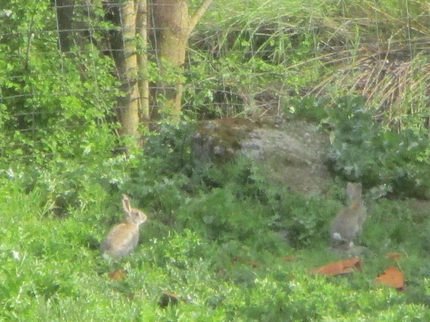 Un par de jóvenes conejos en la maleza,