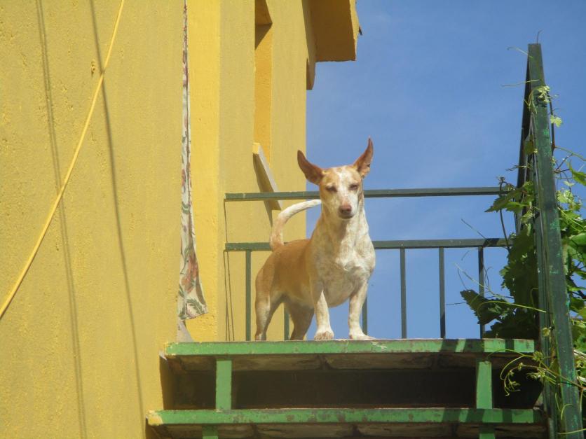 Perrita en lo alto de una escalera,