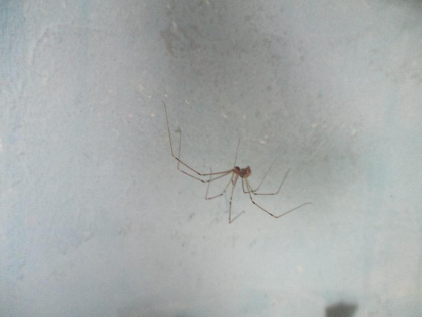 Araña boca abajo colgada de su telaraña,