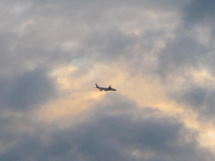 Avión sobre el pueblo al atardecer,
