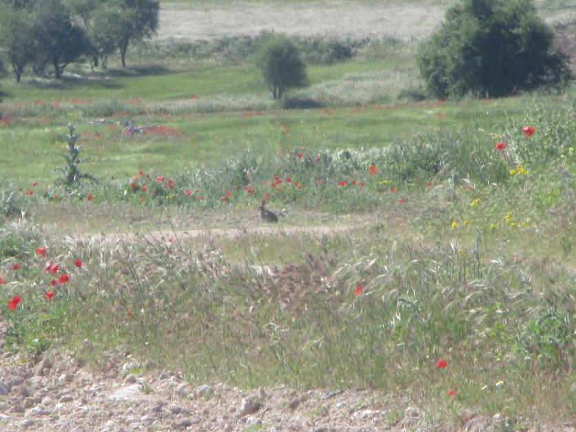Liebre en un terreno con amapolas,