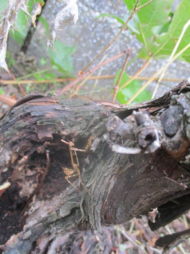 Mantis palo sobre la cepa de una parra,