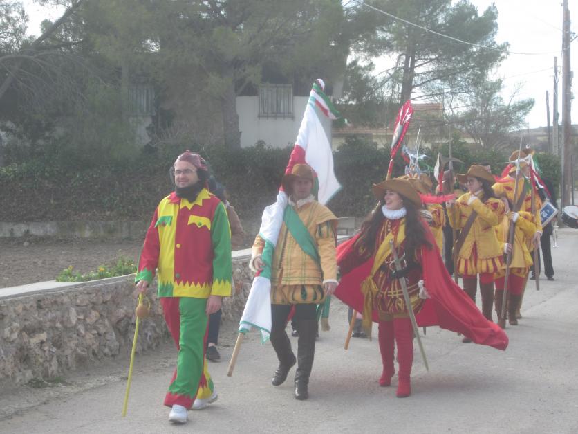 Botarga y soldadesca desfilando en la recogida de autoridades hacia el Ayuntamiento,