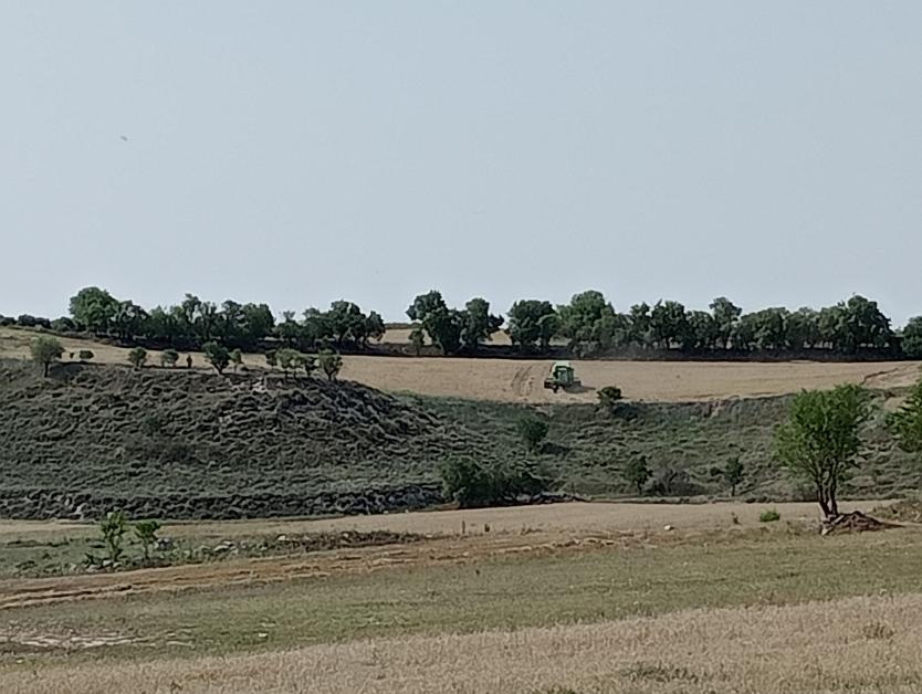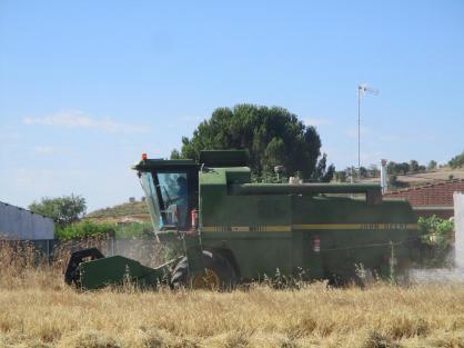 Cosechadora a pleno rendimiento en un campo,