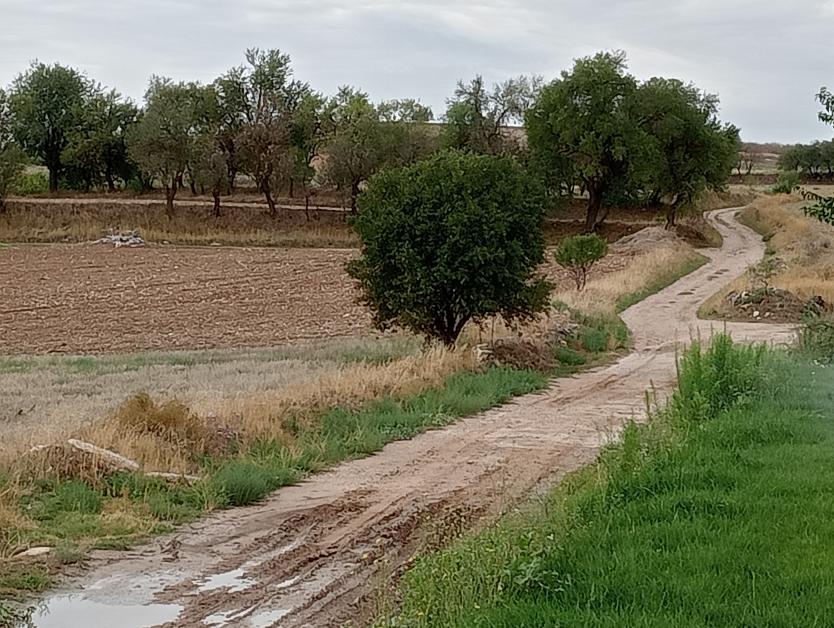 Camino de tierra en mal estado por las recientes tormentas,