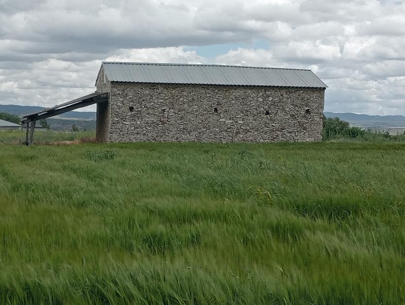 Amenazantes nubes de tormenta sobre un granero de piedra y un campo de cebada,