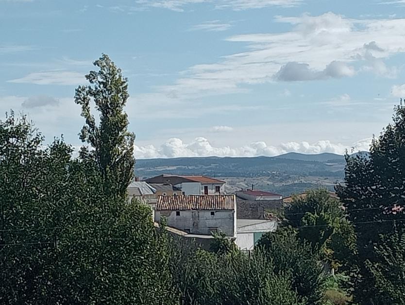 Entre los árboles se ve parte del pueblo y detrás la sierra,