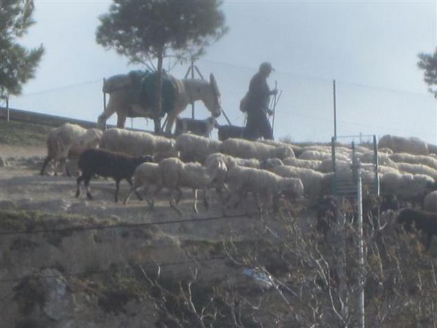 El pastor, la burra y las ovejas un día de niebla,