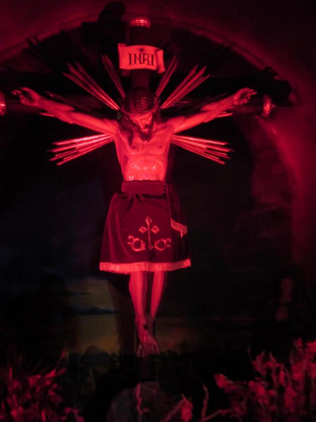 Imagen del Cristo del Calvario iluminada en rojo,