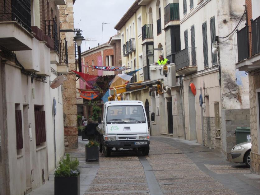 Operario colocando bien los toldos de la feria renacentista,