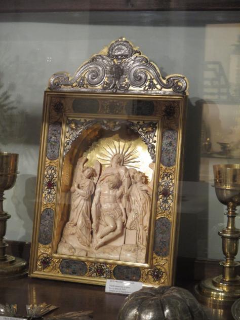 Es del siglo XVII, hecho con marfil y enmarcado en bronce dorado, está en el