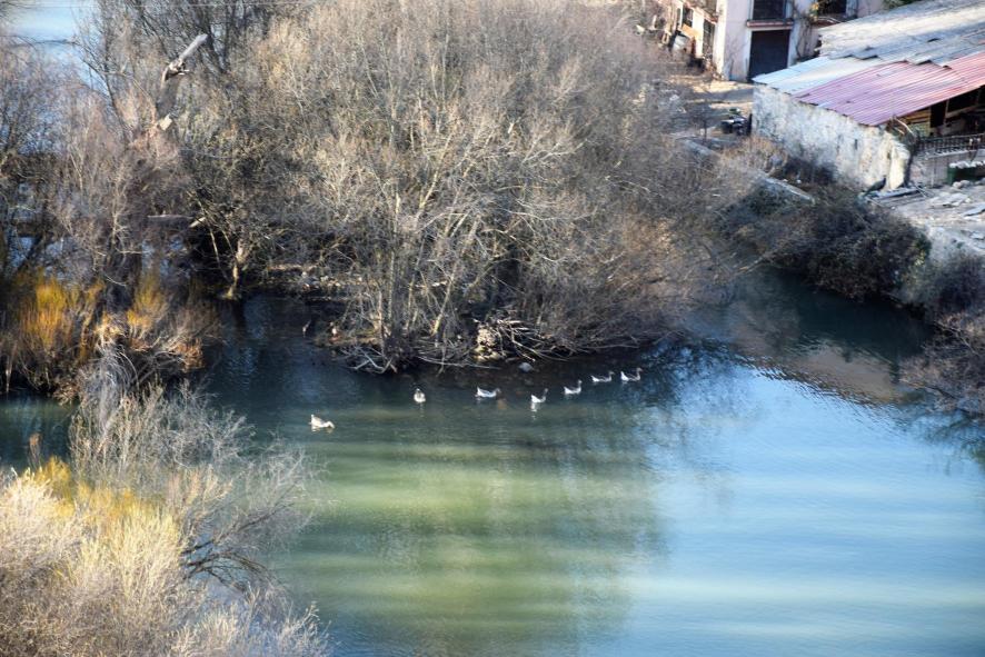 Patos en el río Duratón, vistos desde el muro de la presa,