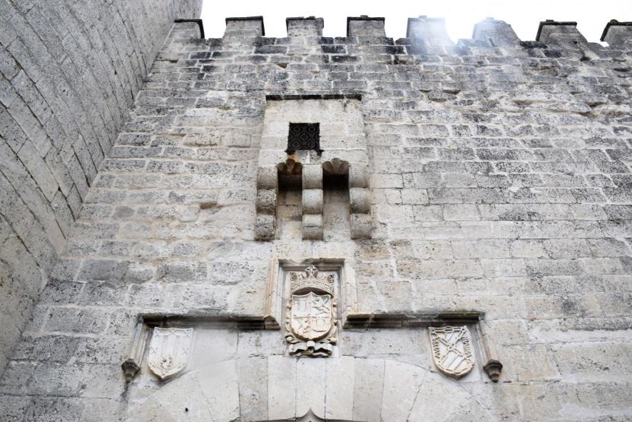 Escudos nobiliarios bajo el matacán,