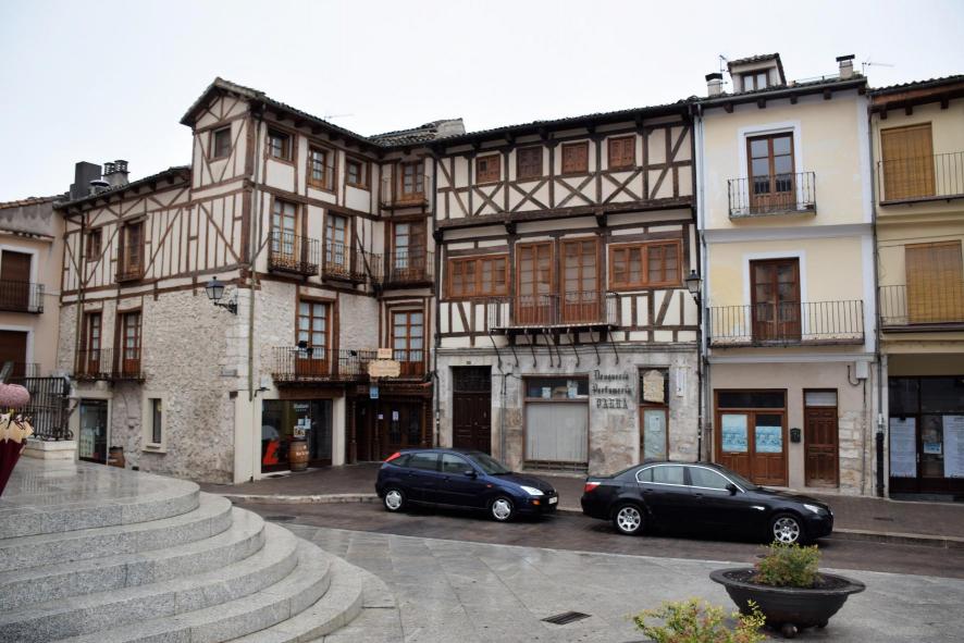 con el típico entramado de madera y adobe castellano y pronunciados