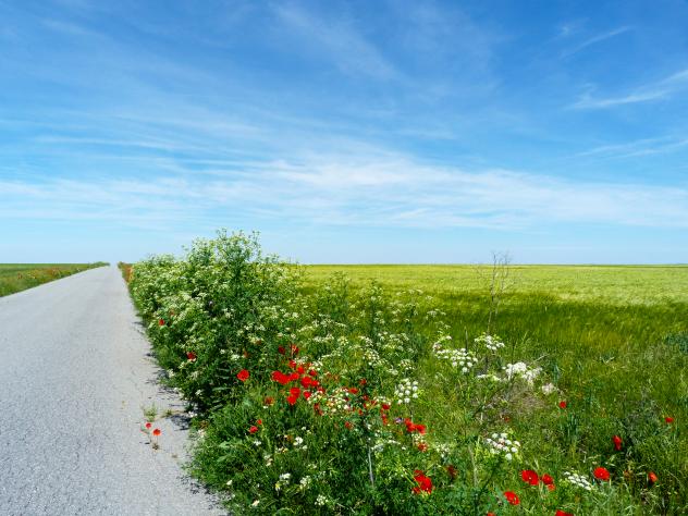 Cereales y flores al lado del camino,