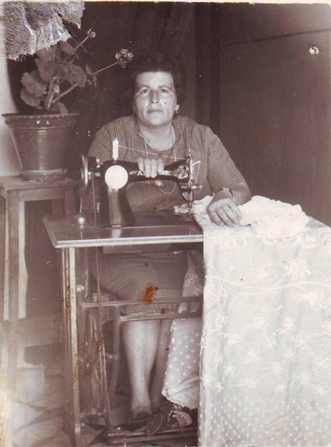 Isabel Gutierrez en el portal de su casa con la máquina de coser cuando tenía 48 años