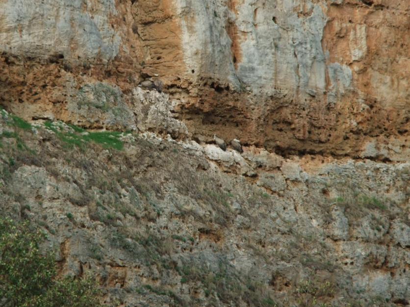 Cuatro buitres posados en la pared,