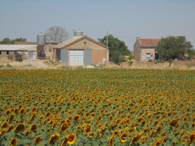 Otra buena vista de girasoles en el pueblo, el verano les va bien. Parecen un ejecito chino en formación, da como agobio verles tan juntos, a la izquierda unas granjas de gallinas primero y luego de cerdos en el centro el antiguo almacén del SENPA, en otras épocas digamos de los años 50 y 60 había constantemente entrada de trigo de los labradores de aquí y del contorno, inmediatamente salida del mismo con camiones diarios, y a la derecha una casa ahora reconstruida y utilizada. JAB