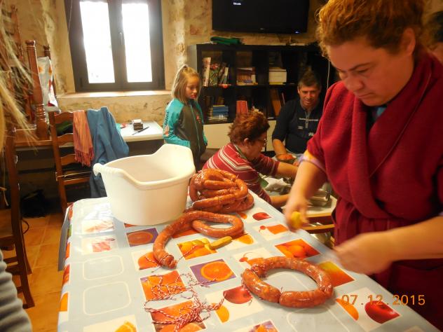 Ana tiene las tiras que la dan los de la maquina ya embutidas y ella con hilo apropiado para ello achoriza es decir hace los choricitas pequeños que conocemos, asi se unen mejor la carne y seca mas rapido, y se corta en porcones mas facilmente.