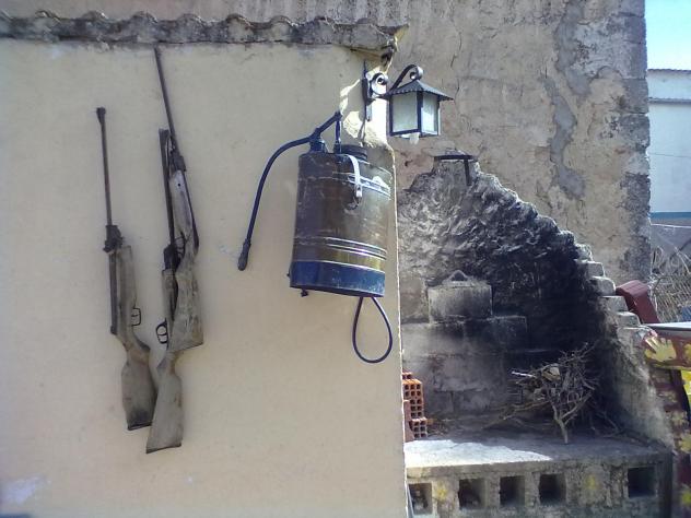 foto puede apreciarse una sulfatadora bastante antigua de las de cobre, ya hace muchos años que no se utiliza asi, ahora son de plástico que pesan mucho menos y son mas manejables aunque verdaderamente mas feas. También se pueden apreciar tres carabinas de las que se usaban en las casetas de tiro de las atracciones de