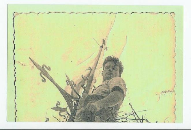 Gracias de nuevo (un Galveño). Este es el momento en que se coloco la bandera en la torre en el año 1958, una de las dos veces que la coloco Jose Gomez. La foto la tomo su amigo Luis Mompo. En ella se aprecia la veleta, el pararayos y el nido de la cigüeña. Se subio en aquel momento con dos escaleras colocadas una sobre la otra y atandose con un cinturon a la veleta para seguridad.