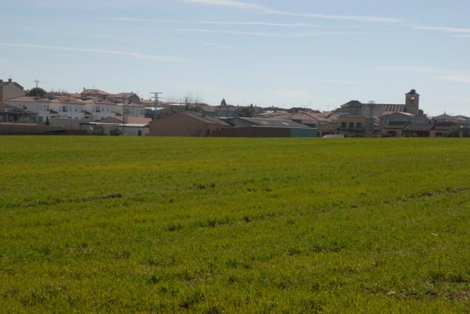 siembra y al fondo el pueblo,