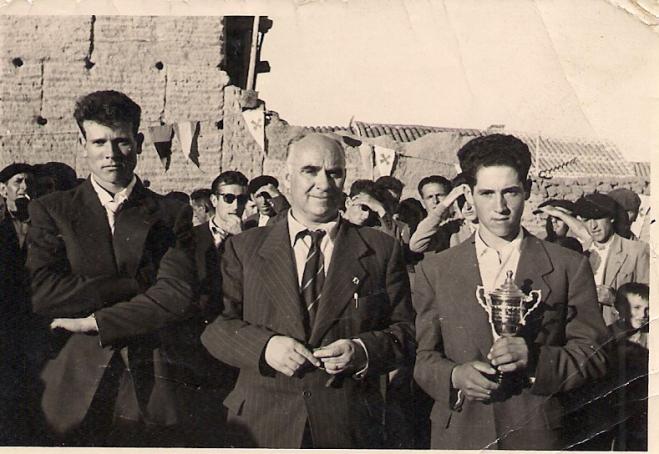 Son, de izquierda a derecha: Eladio Portela, Ramón Muñoz (maestro) Félix Mañas cuando ganaron un campeonato de frontón Esta foto está hecha en BLASCOSANCHO, por eso no podemos conocer a ninguno del pueblo. Un saludo. SON ELADIO D. RAMON Y FËLIX Jugadores de pelota de los años 50. El Sr del centro es D. Ramón Muñoz maestro en los años 50 Pueden ser: