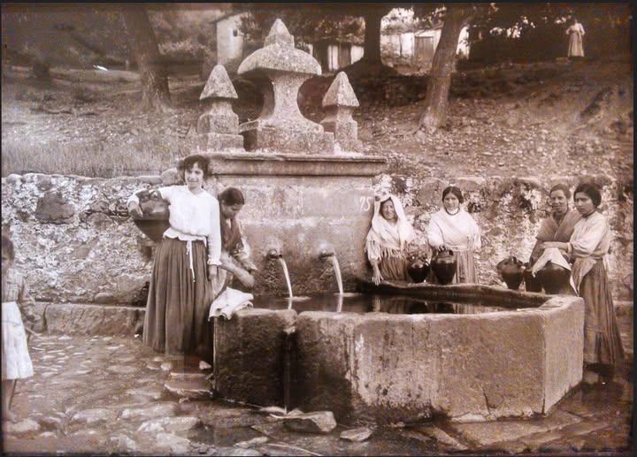 Mujeres con cántaros en una fuente (foto antigua),