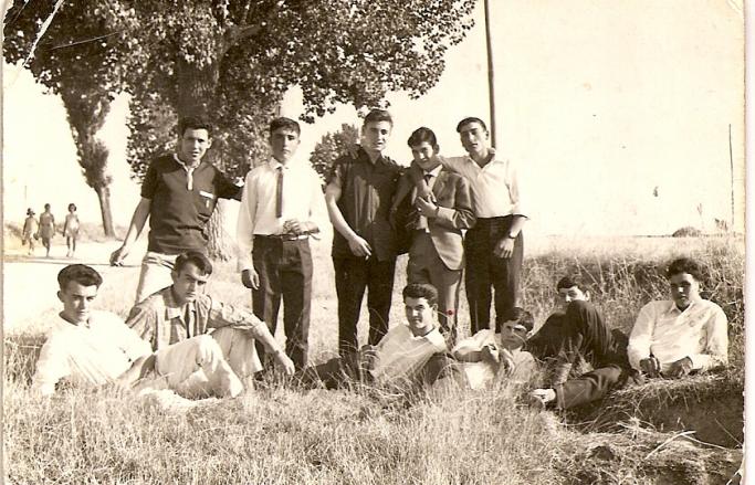 Sentados: Segun, Paco, Miguel, Martín, José Luis el de Sole, José Luis el de floro. Están en la carretera frente a la fuente.