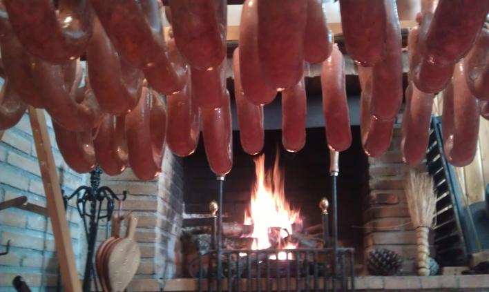 Con la lumbre al fondo, las morcillas se cuelgan en unos palos largos llamados "latas" y se dejan secar al calor de la lumbre de la