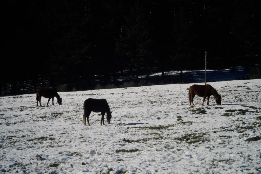 Las yeguas pastan entre la nieve,