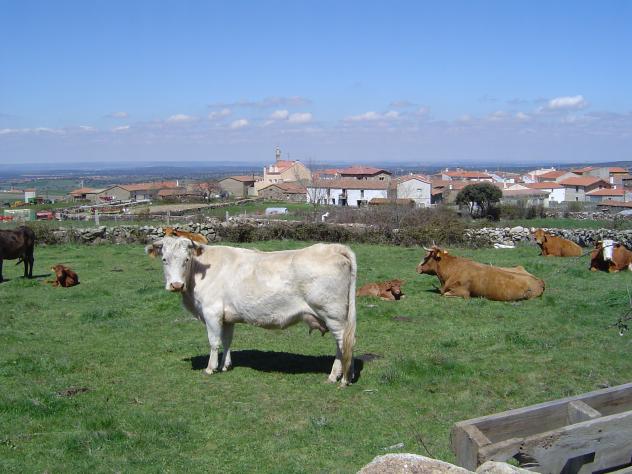 vacas con pueblo de fondo,