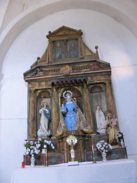 He oido en más de una conversación este verano "El altar de la mil vírgenes", ¿ de dónde ha salido?.Pués ya estan contentos porque nada más queda en este altar la imagen de la Virgen del Rosario.Entiendo que todo el altar estuviera tan repleto de imágenes pero ahora ¿ dónde están las otras vírgenes como por ejemplo, la de Fátima, la Inmaculada y la del Carmen? ¿ Dónde se van a colocar? Pués para muchas personas del pueblo a estas imágenes se las tiene mucha devoción y como ha desaparecido o tirado... El que haya tantas imágenes en este altar se debe a que antes había frente la puerta de entrada al templo otro altar que se llamaba del Pilar y algunas de estas imágenes estaban en el. Y te has olvidado que también está la Virgen del Pilar...Buen batiburrillo de imágenes. Sobran todas menos la del centro y faltan dos imágenes que no se sabe de que santos serían, en las hornacinas o capillitas, derecha e izquierda. La composición del altar, tal como la vemos en este momento es un poco desordenada. Igual que si a álguien le sobraran imágenes y las fuera poniendo allá donde encuentre un hueco. Por quitárselas de encima.