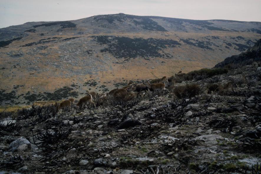 Un rebaño de cabras cruzando una zona de piornos quemada,