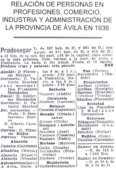 El censo realizado y publicado por el Servicio de Pósitos de 1936 de Pradosegar, relaciona a estas personas. Seguro que entre ellos aparece algún ancestro de los vecinos actuales.
