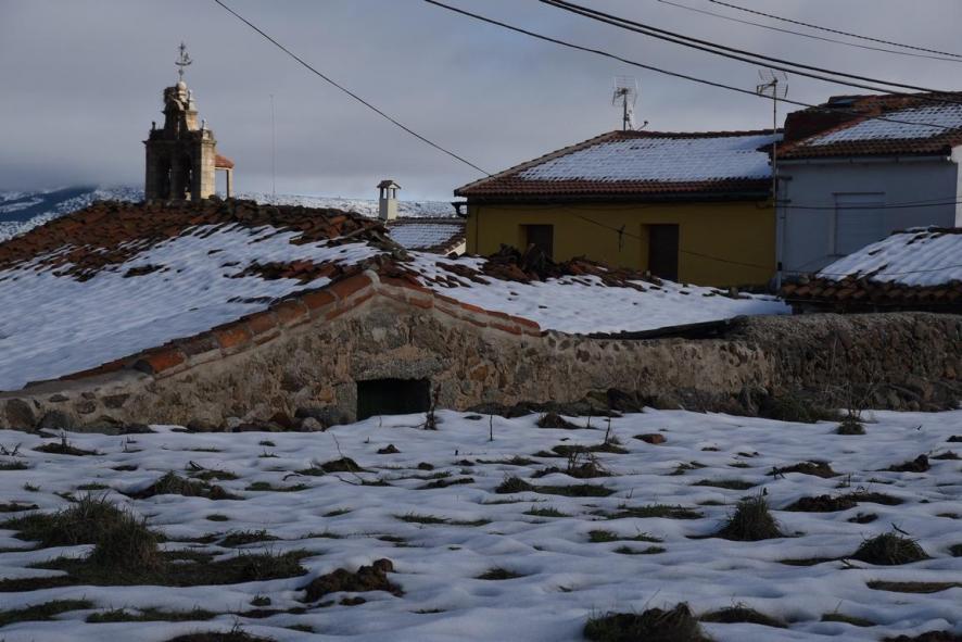 Tejados nevados y la torre de la iglesia,