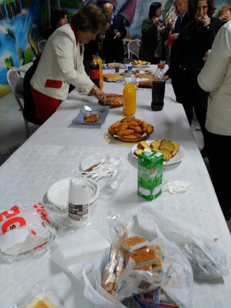 No podía faltar el convite, aunque al ser por la tarde y hacer frío el chocolate nos vino que ni pintado..., los bizcochos, huesillos,