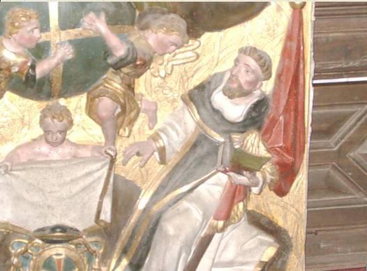 Esta figura tan en primer plano ¿A quién representa? ¿A la Institución Religiosa de los Trinitarios? A uno de sus miembros que tuvo alguna relación con Arcellares? No se ha encontrado respuesta satisfactoria. Seguiremos buscando.