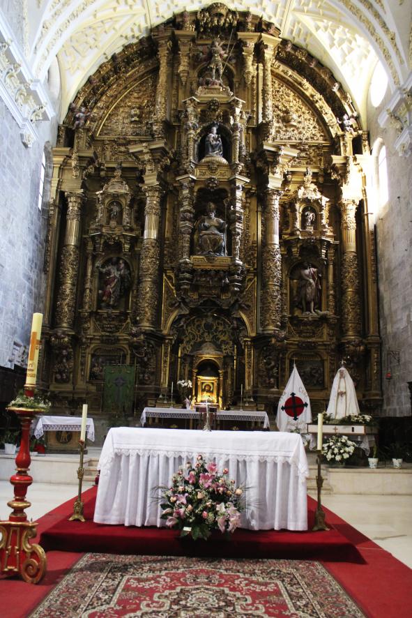 caballo entre el medio punto y el ligero apuntamiento, y plementería decorada con yeserías barrocas cromadas en blanco y ocre. Las nervaduras tardogóticas fueron respetadas en esta intervención, que dejó al descubierto su aparejo de
